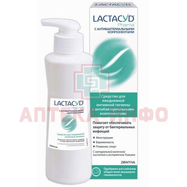 - LACTACYD PHARMA с антибактериальными компонентами создано специально для усиления естественной защиты интимной зоны. В его состав входят активные природные компоненты. Натуральная молочная кислота поддерживает сбалансированный pH интимной микрофлоры. Экстракт Тимьяна оказывает антисептическое и антибактериальное действие, тем самым укрепляя естественный защитный барьер и предотвращая появление бактериальных инфекций и неприятного запаха. А его легкий и приятный травяной аромат подарит вам чувство изумительной свежести.