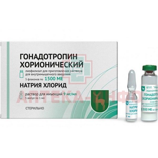 Гонадотропин хорионический фл.(лиоф. д/приг. р-ра д/в/м введ.) 1500 МЕ №5 + р-ль Московский эндокринный завод (МЭЗ)/Россия/Фермент/Россия