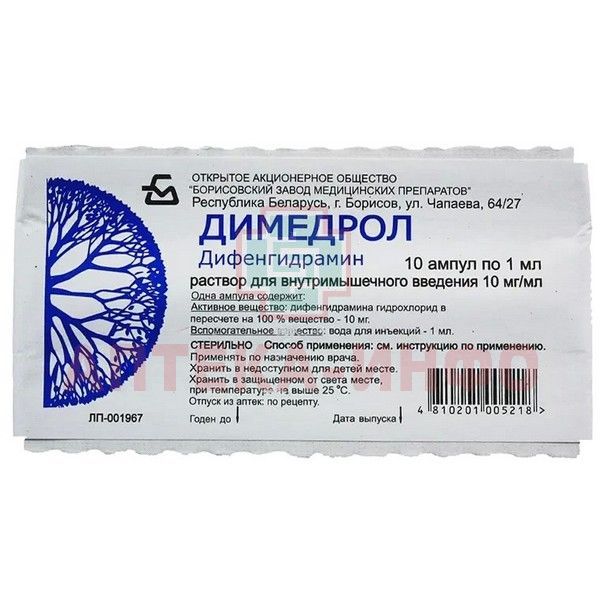Димедрол амп.(р-р д/в/в и в/м введ.) 10мг/мл 1мл №10 короб.карт. Борисовский ЗМП/Беларусь