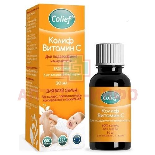 - Витамин С ирландского бренда Колиф (Colief) - гипоаллергенный витамин С натурального происхождения в глицерине. Без сахара, ароматизаторов, красителей и консервантов! Не содержит дрожжей, глютена, кукурузы, крахмала, пшеницы, орехов, сои и молочных продуктов. В России разрешен к применению у детей с 1,5 лет, а в странах ЕС и Великобритании с 1 года.