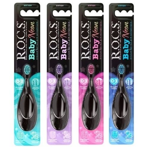 - Детская зубная щетка R.O.C.S. «Baby Neon» учитывает возрастные особенности данного периода и имеет экстрамягкие щетинки, которые не повреждают нежную эмаль и мягкие ткани ротовой полости ребенка.
