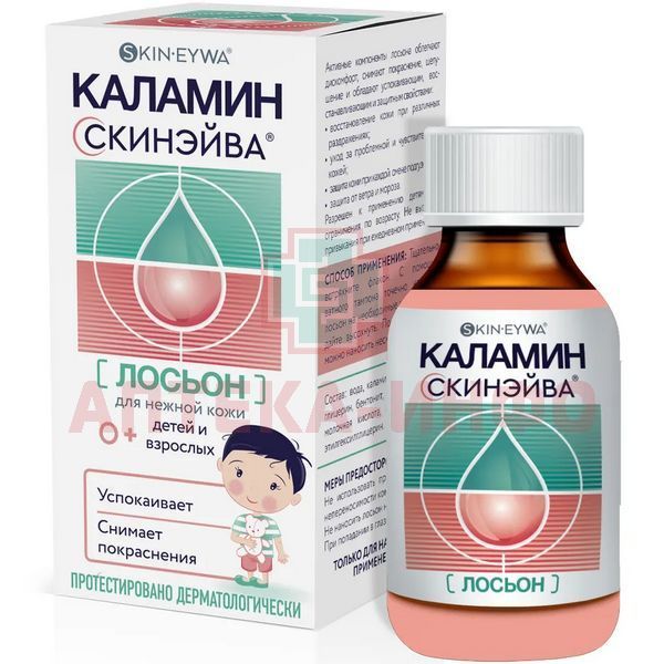 - Входящие в состав активные компоненты Лосьона Каламин (СКИНЭЙВА) SKINEYWA® обладает выраженным подсушивающим, восстанавливающим, и успокаивающим свойствами. Существенно облегчают ощущения дискомфорта, снимают покраснения и формирует защитный барьер на коже.