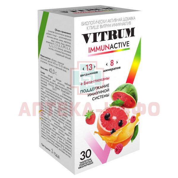 - Витаминно-минеральный комплекс ВИТРУМ ИММУНАКТИВ VITRUM IMMUNACTIVE содержит 13 витаминов и 8 минералов, а также бета-глюканы и биофлаваноидный комплекс - необходимые компоненты, которые синергично работают для поддержки иммунитета: