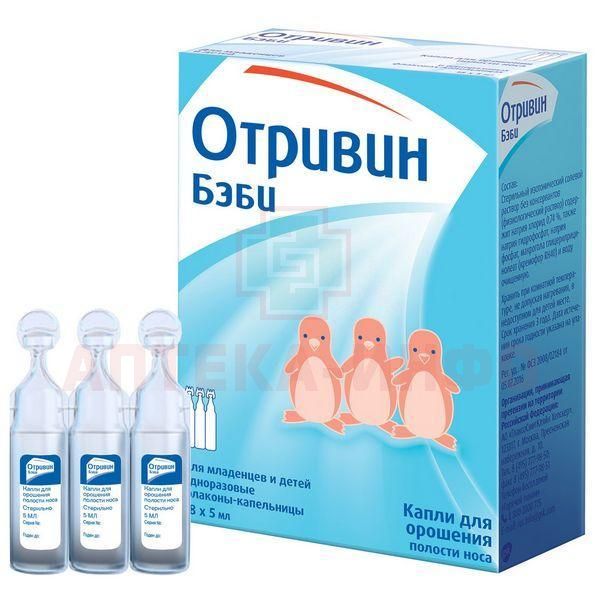 Отривин Бэби капли для орошения полости носа в одноразовых флаконах-капельницах - создан для ухода за полостью носа младенцев и детей до 1 года и старше, для увлажнения и очищения слизистой оболочки носа. Это стерильный изотонический раствор натрия хлорида, уровень рН которого близок естественной секреторной жидкости слизистой носа.
