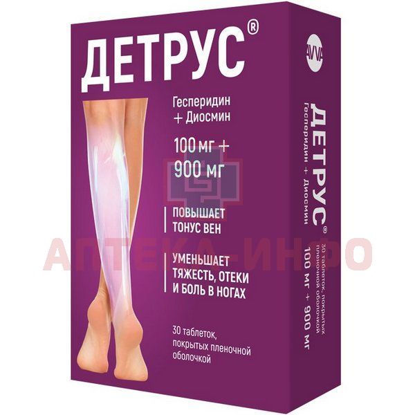 Препарат Детрус обладает венотонизирующим и ангиопротективным свойствами. Препарат уменьшает растяжимость вен и венозный застой, снижает проницаемость капилляров и повышает их резистентность. Результаты клинических исследований подтверждают фармакологическую активность препарата в отношении показателей венозной гемодинамики. Статистически достоверный дозозависимый эффект комбинации гесперидин + диосмин был продемонстрирован для следующих венозных плетизмографических параметров: венозной емкости, венозной растяжимости, времени венозного опорожнения. Оптимальное соотношение "доза-эффект" наблюдается при приеме 1000 мг.