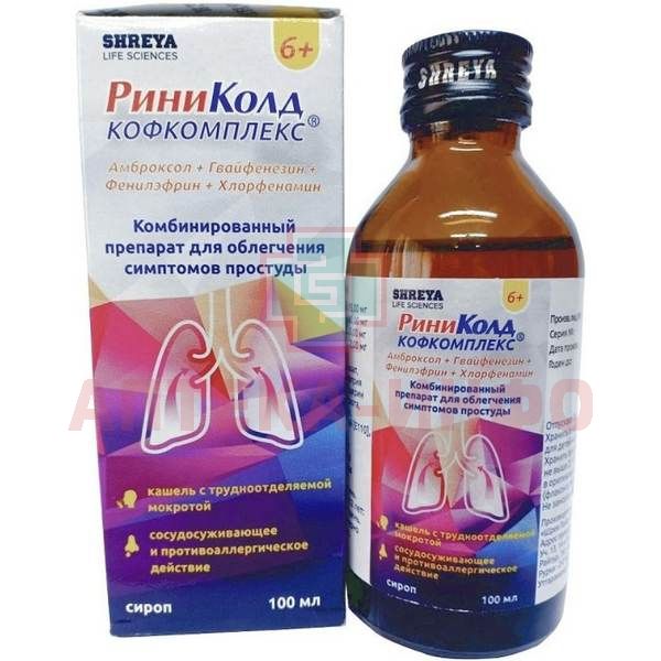- РиниКолд КОФКОМПЛЕКС® - сироп - комбинированный препарат, входящие в его состав гвайфенезин и амброксол снижают вязкость бронхиального секрета и облегчают отхаркивание. Хлорфенамина малеат оказывает противоаллергическое действие: устраняет слезотечение, зуд в глазах и носу. Фенилэфрина гидрохлорид оказывает сосудосуживающее действие, уменьшает отечность и гиперемию слизистых оболочек верхних отделов дыхательных путей и придаточных пазух.