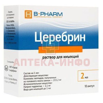 - Препарат Церебрин содержит низкомолекулярные биологически активные нейропептиды, которые проникают через гематоэнцефалический барьер и непосредственно поступают к нервным клеткам. Препарат обладает органоспецифическим мультимодальным действием на головной мозг, т.е. обеспечивает метаболическую регуляцию, нейропротекцию, функциональную нейромодуляцию и нейротрофическую активность.