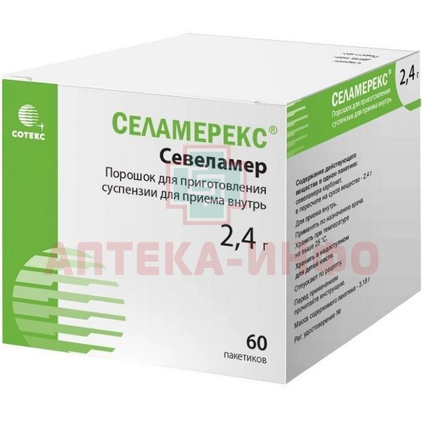 - Каждый пакетик содержит 2,4 г севеламера в виде карбоната (в пересчете на сухое вещество).