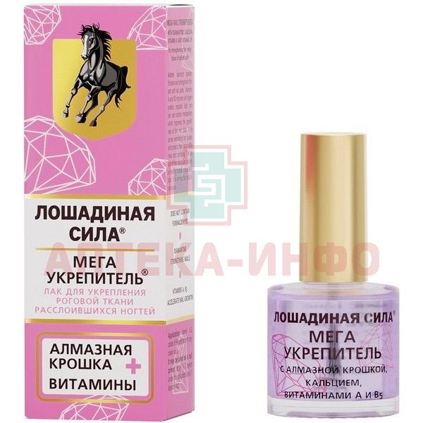 - ЛОШАДИНАЯ СИЛА МЕГАУКРЕПИТЕЛЬ ДЛЯ НОГТЕЙ С АЛМАЗНОЙ КРОШКОЙ КАЛЬЦИЕМ ВИТАМИНАМИ А И В5 - восстанавливает расслаивающиеся ногтевые пластины. Предохраняет от ломкости и крошения