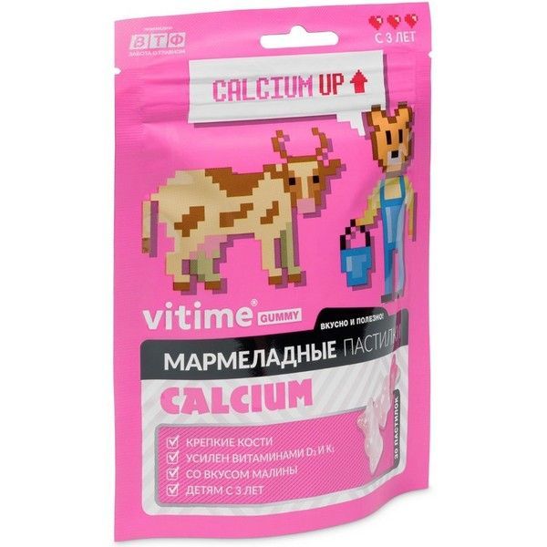 - Биологически активная добавка к пище «VITime ® Мармеладные пастилки Кальций + D3» - Комплекс кальция и витаминов D3 и К1 для правильного роста и формирования костей и зубов у детей.