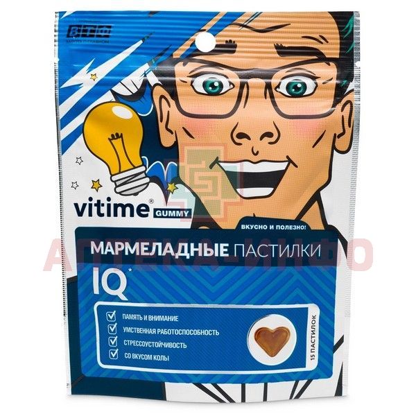 - VITime Gummy IQ-комплекс витаминов, микро- и макроэлементов для улучшения памяти, концентрации внимания и работоспособности при повышенных эмоциональных и умственных нагрузках.