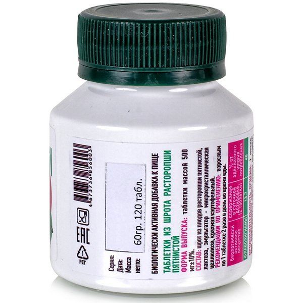 - Таблетки из расторопши пятнистой - источник флаволигнанов (силимарин и др.). используется для поддержания функций печени, селезёнки, при запорах, токсических поражениях печени, защищает клетки печени и слизистой желудочно-кишечного тракта от воздействий неблагоприятных факторов (канцерогенов, перекиси жиров, консервантов, красителей, содержащихся в продуктах питания), оказывает противовоспалительное, мягкое желчегонное и слабительное действие.