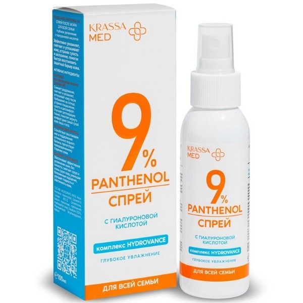 - KRASSA MED PANTHENOL 9% Спрей после загара для всей семьи «глубокое увлажнение» с гиалуроновой кислотой.