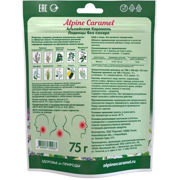- Леденцы Alpine Caramel Альпийская Карамель содержат кармоловое масло (уникальный комплекс эфирных масел 10 лекарственных растений), витамин С и ментол. Эфирные масла лекарственных растений в составе кармолового масла известны своими целебными свойствами уже несколько веков.