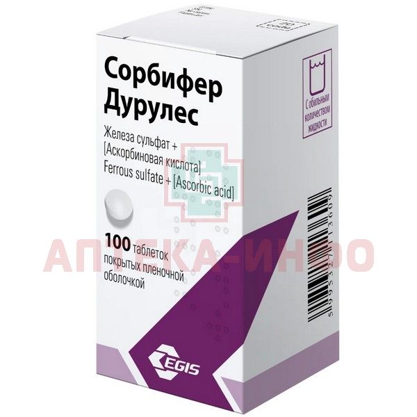 - Железо - незаменимый компонент организма, необходимый для образования Hb и протекания окислительных процессов в живых тканях. Препарат применяется для устранения дефицита железа. Пластиковый матрикс таблеток Сорбифер Дурулес полностью инертен в пищеварительном соке, но полностью распадается под действием кишечной перистальтики, когда активный ингредиент полностью высвобождается.
