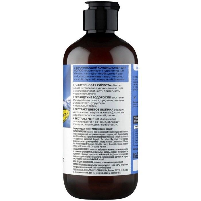- PLANETA ORGANICA КОНДИЦИОНЕР ДЛЯ ВОЛОС УВЛАЖНЯЮЩИЙ TICKET TO ICELAND - нормализует гидролипидный баланс, насыщает необходимой влагой, восстанавливает эластичность, способствует лёгкому расчёсыванию.