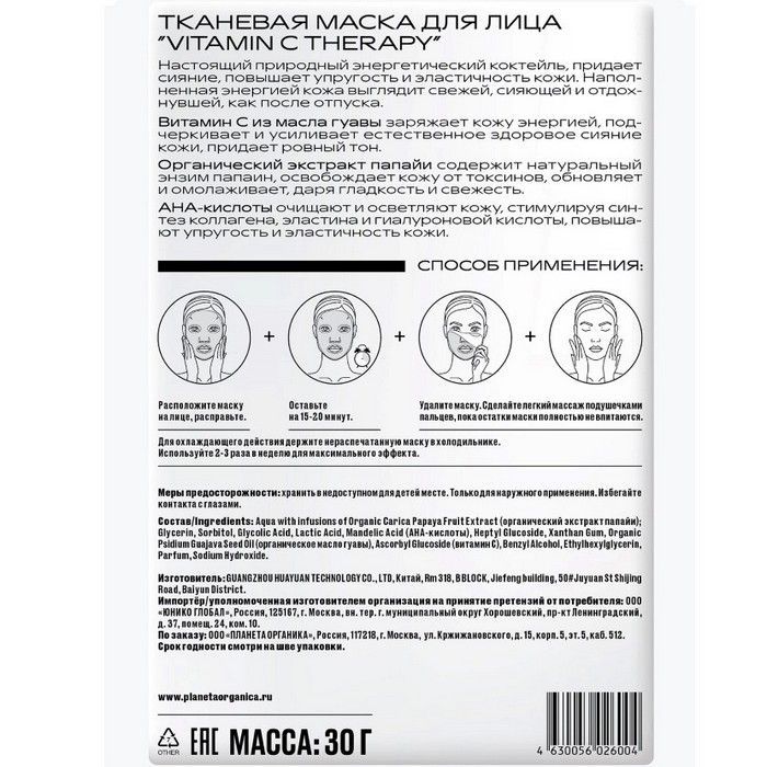 Planeta Organica маска д/лица тканевая Vitamin Therapy №1 GUANGZHOU HUAYUAN TECHNOLOGY/Китай