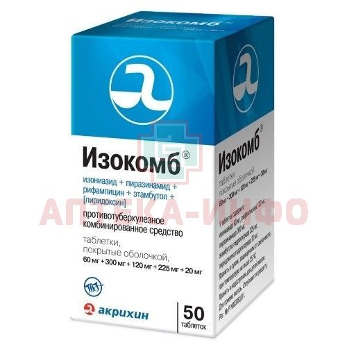 - Изокомб® представляет собой пятикомпонентный препарат, содержащий фиксированное количество изониазида, рифампицина, пиразинамида, этамбутола и пиридоксина гидрохлорида.