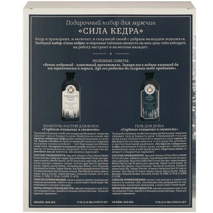 - Выбирай набор «Сила кедра» и морозная таёжная свежесть на весь день тебя взбодрит, на работу настроит и на веселье наладит.