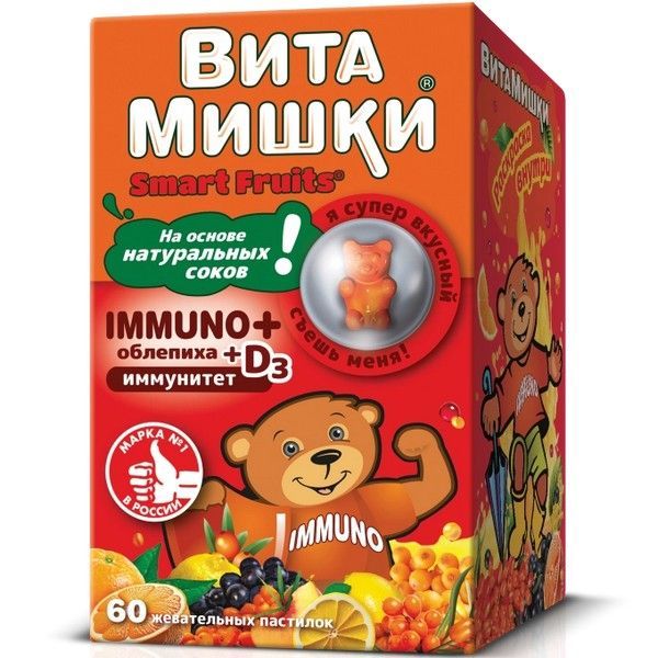 - ВитаМишки® Immuno + облепиха - сбалансированный витаминно-минеральный комплекс в виде вкусных мармеладных пастилок-мишек с натуральными фруктовыми и овощными экстрактами для детей с 3-х лет.
