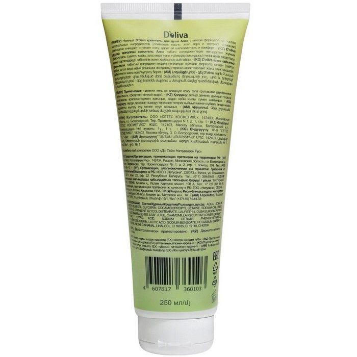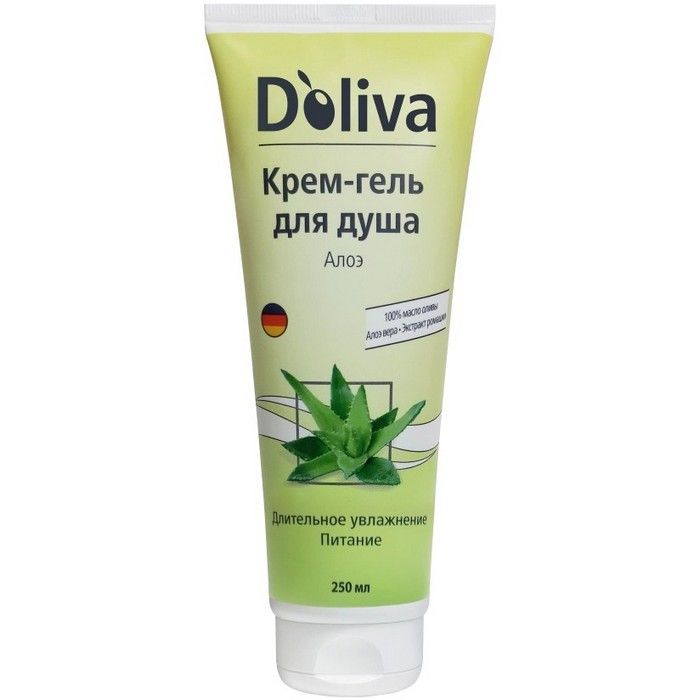 - Нежный крем-гель для душа D'oliva с мягкой формулой на основе натуральных ингредиентов (Оливковое масло, алоэ вера, экстракт ромашки) деликатно очищает и питает кожу, дарит ей шелковистость и комфорт.