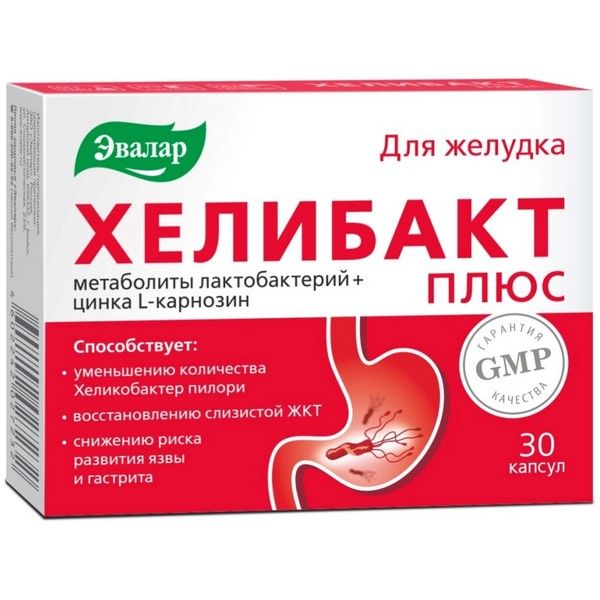 - Хелибакт Плюс - сбалансированный комплекс метабиотика и цинка L-карнозина. Метабиотик, содержащий специальные метаболиты лактобактерий, которые, попадая в желудок, начинают действовать сразу: связываются с бактериями Helicobacter pylori и естественным способом выводят их из организма. Способствует уменьшению количества Helicobacter pylori в желудке, снижению риска возникновения и развития язвы и гастрита, улучшению пищеварения, поддержке баланса микрофлоры желудка. Цинка L-карнозин - хелатная (биодоступная) форма цинка способствует: восстановлению слизистой ЖКТ, защите от воспаления и образования язв.