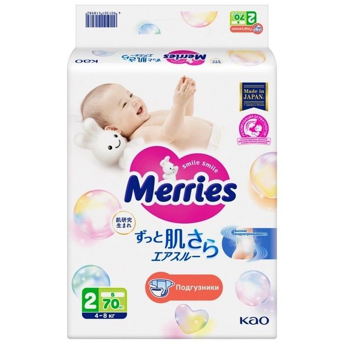 - MERRIES ПОДГУЗНИКИ ДЕТСКИЕ для малышей с весом 4-8 кг (размер S, 2 ) созданы с особенной заботой о коже и комфорте Вашего ребёнка.