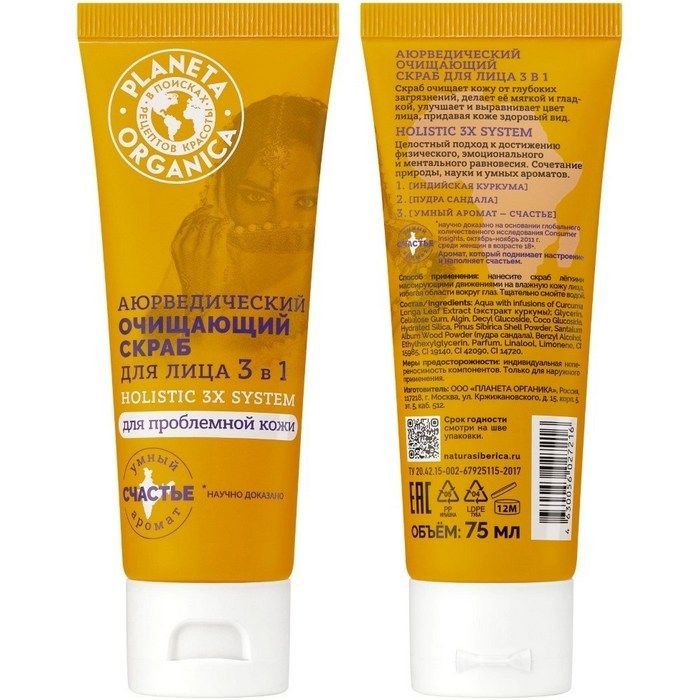 Planeta Organica скраб д/лица 3в1 очищающий Аюрведический 75мл Планета Органика