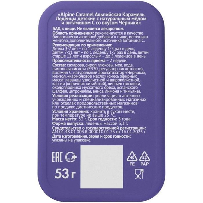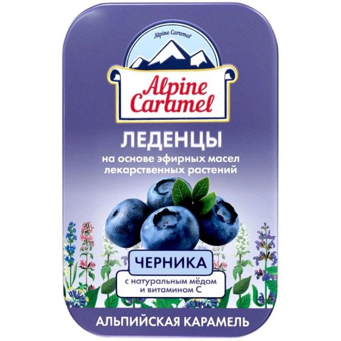 - ALPINE CARAMEL ЛЕДЕНЦЫ АЛЬПИЙСКАЯ КАРАМЕЛЬ ДЕТСКИЕ С НАТУРАЛЬНЫМ МЕДОМ И ВИТАМИНОМ С СО ВКУСОМ ЧЕРНИКИ 53г