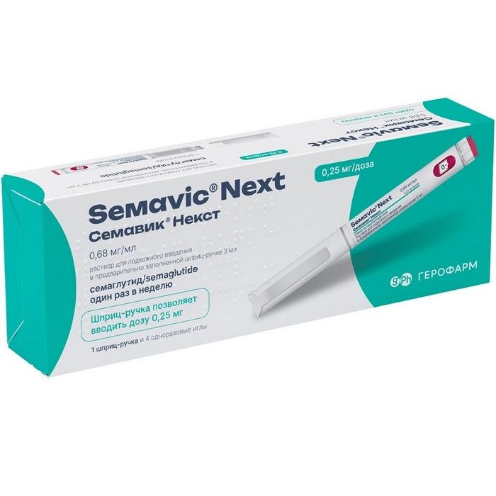 - Семавик® Некст (0,25 мг/доза, 0,5 мг/доза, 1 мг/доза, 1,7 мг/доза, 2,4 мг/доза) - раствор для подкожного введения в предварительно заполненной шприц-ручке. Одна шприц-ручка содержит 3 мл раствора.
