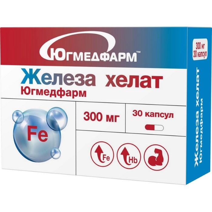 - Железа Хелат Югмедфарм капсулы содержит в своем составе 20мг бисглицинатного железа, это наиболее доступная форма по данным клинических исследований. Она лучше усваивается и имеет более высокий уровень пациентов с меньшим количеством побочных эффектов со стороны желудочно-кишечного тракта.