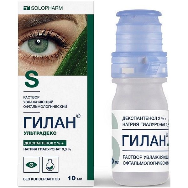 - Раствор увлажняющий офтальмологический Гилан® Ультрадекс воспроизводит действие естественной слезы, защищает и увлажняет поверхность глаза и смазывает ее. Это средство оказывает долговременное облегчающее действие при сухости глаз, обусловленной различными факторами: