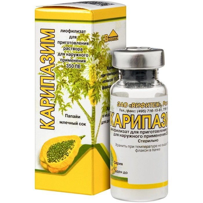 - Карипазим изготавливают из Прокарипазима экстракта сухого, получаемого из высушенного млечного сока незрелых плодов дынного дерева (папайи) - Carica papaya L., семейство папаевые - Caricaceae) путем растворения сухого экстракта в воде для инъекций, последующей стерильной фильтрации раствора и сублимационной сушки.