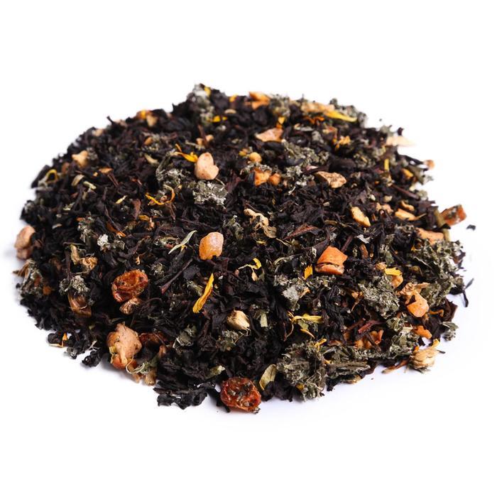 По-настоящему живительный напиток! Черный чай Ассам тонизирует организм, а дробленый имбирь и ягоды облепихи полезны при простуде и гриппе. Имбирь способен снимать боль в горле, обладает высоким отхаркивающим действием, при гриппе и простуде он просто незаменим - понижает температуру тела, согревает, повышает тонус и придает жизненную энергию. Облепиха, помимо укрепления иммунитета, насыщает организм нужными витаминами. А листья малины и лепестки календулы дарят данному купажу свой невероятный, ягодный вкус и цветочный аромат.