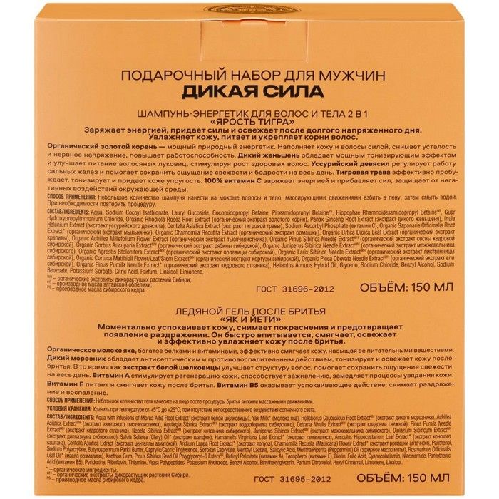 - Aqua, Sodium Cocoyl Isethionate, Lauryl Gucoside, Cocomidopropyl Betaine, Pineamidoprohyl BetainePS, Hippophae Rhamnoidesamidopropyl BetaineHR, Guar Hydroxypropyltrimonium Chloride, Organic Rhodiola Rosea Root Extract (органический экстракт золотого корня), Panax Ginseng Root Extract (экстракт дикого женьшеня), Inula Helenium Extract (экстракт уссурийского девясила), Сentella Asiatica Extract (экстракт тигровой травы), Sodium Ascorbyl Phosphate (витамин С), Organic Saponaria Offiсinalis Root Extraсt* (органический экстракт мыльнянки), Organic Chamomila Recutita Extraсt (органический экстракт ромашки), Organic Urtiсa Dioiсa Leaf Extraсt (органический экстракт крапивы), Organic Aсhillea Millefolium Flower Extract (органический экстракт тысячелистника), Organic Pinus Sibiriсa Needle Extraсt WH (органический экстракт сосны кедровой сибирской), Organic Sorbus Aucuparia Extraсt WH (органический экстракт рябины сибирской), Organic Juniperus Sibiriсa Needle Extraсt WH (органический экстракт можжевельника сибирского), Organic Agrostis Stolonifera Extraсt WH (органический экстракт полевицы сибирской), Organic Larix Sibirica Needle Extraсt WH (органический экстракт лиственницы сибирской), Organic Сortusa Matthioli Flower/Leaf/Stem ExtractWH (органический экстракт кортузы сибирской), Organic Piсea Obovata Needle ExtractWH (органический экстракт ели сибирской), Organic Pinus Pumila Needle Extraсt* (органический экстракт кедрового стланика), Heliantus Annuus Hybrid Oil, Glycerin, Sodium Сhloride, Benzyl Alcohol, Sodium Benzoate, Potassium Sorbate, Сitric Acid, Parfum, Linalool, Limonene.