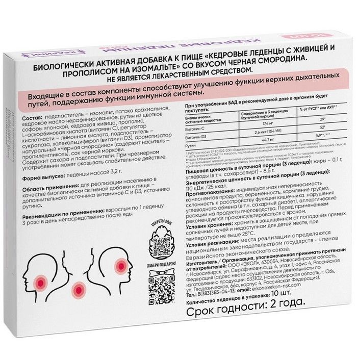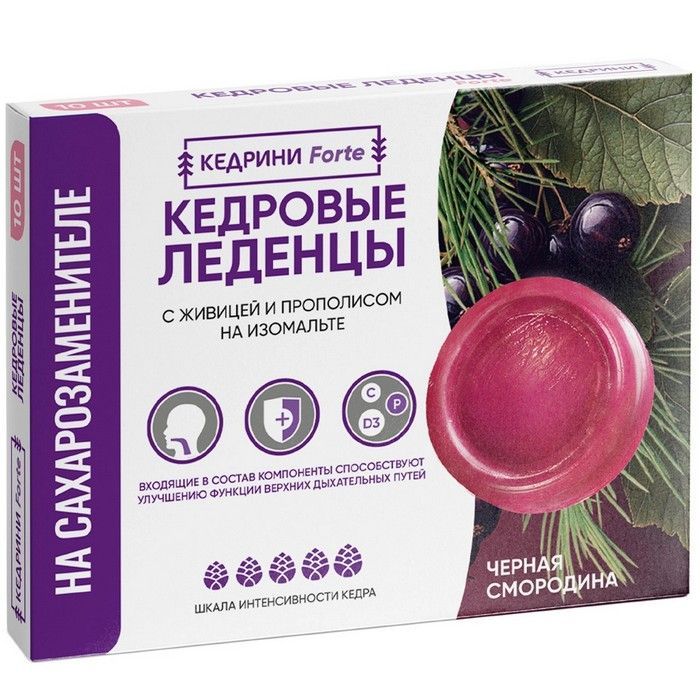 - КЕДРИНИ FORTE КЕДРОВЫЕ ЛЕДЕНЦЫ С ЖИВИЦЕЙ И ПРОПОЛИСОМ НА ИЗОМАЛЬТЕ СО ВКУСОМ ЧЕРНАЯ СМОРОДИНА - Биологически активная добавка (БАД) к пище