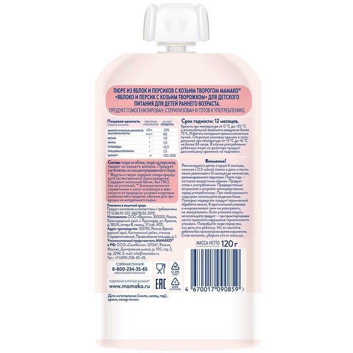 МАМАКО ПЮРЕ ИЗ ЯБЛОК И МАНГО С КОЗЬИМ ТВОРОЖКОМ - для детского питания для детей раннего возраста. Продукт гомогенизирован, стерилизован и готов к употреблению. Возраст: для детей с 6 месяцев.