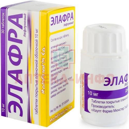Сообщалось об очень редких случаях возникновения синдрома Стивенса-Джонсона или токсического эпидермального некролиза у пациентов, получавших лефлуномид. В случае возникновения кожных реакций и/или реакций со стороны слизистых оболочек необходимо отменить прием препарата Элафра и любого другого связанного с ним препарата и немедленно начать процедуру отмывания. Необходимо достигнуть полного выведения препарата из организма. В подобных случаях повторное назначение препарата противопоказано. Инфекции. Известно, что препараты, подобные лефлуномиду и обладающие иммуносупрессивными свойствами, делают больных более чувствительными к различного рода инфекциям, включая оппортунистические инфекции (инфекции, вызываемые грибками и микроорганизмами, способными вызывать инфекции только в условиях снижения иммунитета). Возникшие инфекционные заболевания протекают, как правило, тяжело и требуют раннего и интенсивного лечения. При возникновении тяжелого инфекционного заболевания может понадобиться прервать лечение лефлуномидом и начать процедуру отмывания.
