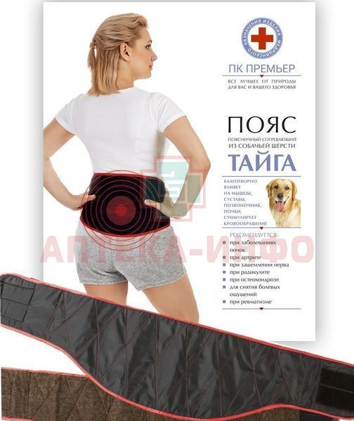 - Пояс «Тайга» надевается на поясницу шерстью к больному месту как на обнаженное тело, так и на нижнее бельё. Пояс может использоваться как медицинских, спортивно-оздоровительных учреждениях так и в домашних условиях. Пояс «Тайга» также используется в лечебных целях в сочетании с фармацевтическими препаратами.