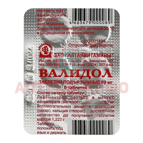 Валидол таб. сублингв. 60мг №6 Алтайвитамины
