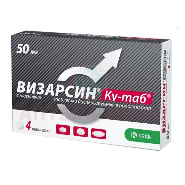 - Препарат Визарсин® Ку-таб®, таблетки, диспергируемые в полости рта, может применяться пациентами, которые испытывают трудности при проглатывании таблетки, в качестве альтернативы препаратам силденафила в лекарственных формах: таблетки и таблетки, покрытые пленочной оболочкой.