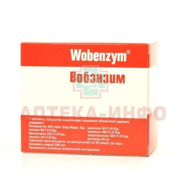 Вобэнзим представляет собой комбинацию натуральных энзимов растительного и животного происхождения. Поступая в организм, энзимы всасываются из тонкого кишечника путем резорбции интактных молекул и, связываясь с транспортными белками крови, попадают в кровоток. В дальнейшем энзимы, мигрируя по сосудистому руслу и накапливаясь в зоне патологического процесса, оказывают иммуномодулирующее, противовоспалительное, фибринолитическое, противоотечное, антиагрегантное и вторичное анальгезирующее действие.