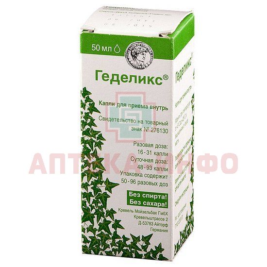 Геделикс - средство растительного происхождения. Оказывает противовоспалительное, ранозаживляющее, антиоксидантное действие. Сапонины проявляют антибактериальную и противогрибковую активность. Тритерпеноиды альфа-хедерин, хедеросапонины оказывают спазмолитическое, муколитическое и отхаркивающее действие. Флавоноиды (рутин, производные кемпферола) улучшают микроциркуляцию, проявляют гепато- и нефропротекторные свойства, повышают диурез, способствуют выведению солей мочевой кислоты.