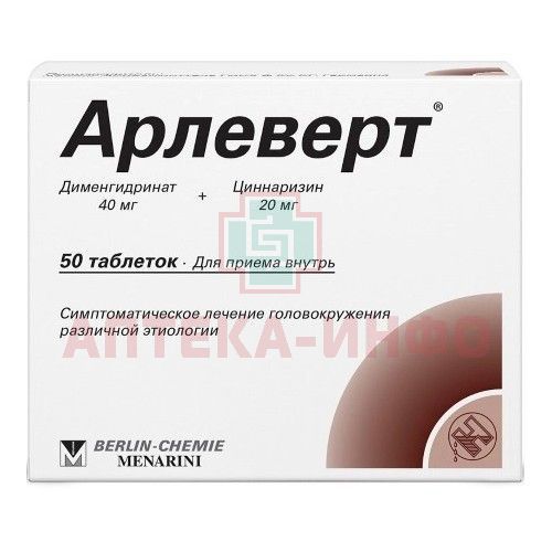 - Препарат Арлеверт® - комбинированный препарат, в состав которого входит дименгидринат, антигистаминное средство с антихолинергической (М-холиноблокирующей) активностью и циннаризин - блокатор «медленных» кальциевых каналов.