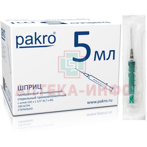 - PAKRO Шприц одноразовый, стерильный трёхкомпонентный, объёмом 5 мл, c иглой 0,7х40мм (22G)