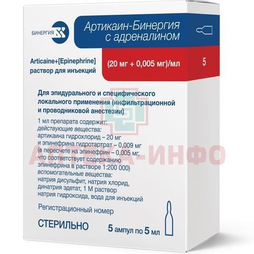 Артикаин-Бинергия с адреналином амп.(р-р д/ин.) 20мг/мл +0,005мг/мл 5мл №5 Армавирская биофабрика