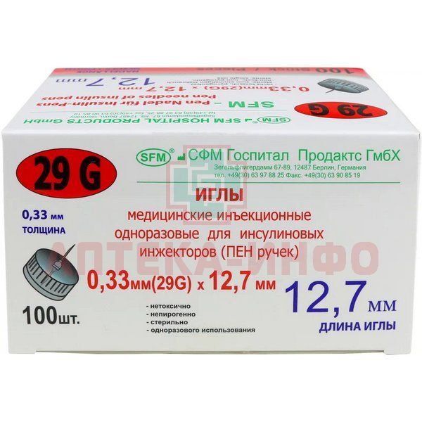 - ИГЛЫ МЕДИЦИНСКИЕ ИНЪЕКЦИОННЫЕ ОДНОРАЗОВЫЕ ДЛЯ ИНСУЛИНОВЫХ ИНЖЕКТОРОВ (ПЕН РУЧЕК) 29G 0,33Х12,7ММ - последнее поколение одноразовых игл медицинских инъекционных SFM для инсулиновых инжекторов (ПЕН ручек) имеет ряд преимуществ: