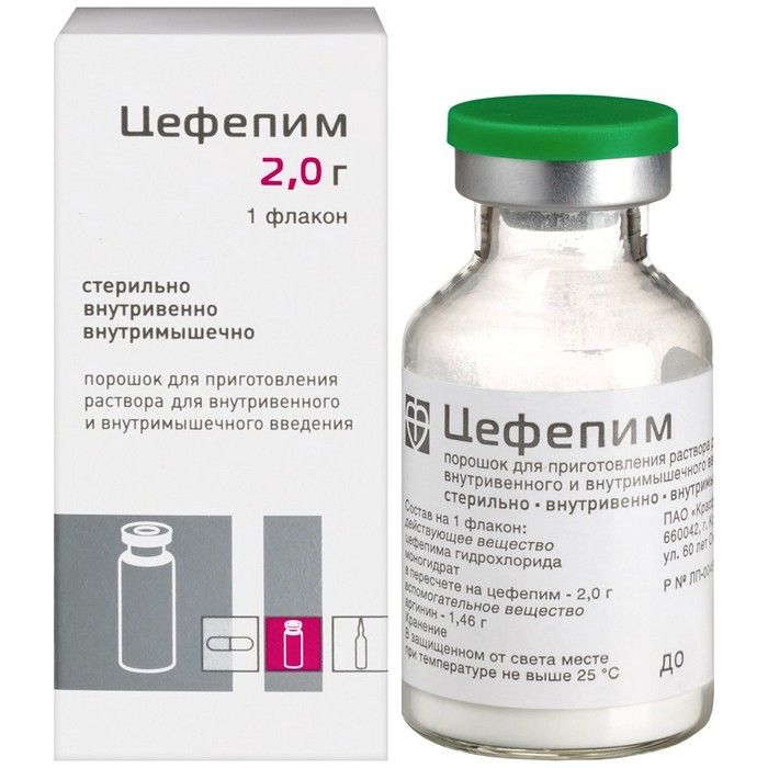 60 Обычная доза, в за 0,5 г каждые 12 ч висимости от тяжест 1 г каждые 12 ч и инфекции, корректи) 2 г каждые 12 ч ювки не требуется 2 г каждые 8 ч30-60 0,5 г каждые 24 ч 1 г каждые 24 ч 2 г каждые 24 ч 2 г каждые 12 ч11-29 0,5 г каждые 24 ч 0,5 г каждые 24 ч 1 г каждые 24 ч 2 г каждые 24 ч<11 0,25 г каждые 24 ч 0,25 г каждые 24 ч 0,5 г каждые 24 ч 1 г каждые 24 чПри непрерывном амбулаторном перитонеальном диализе рекомендуемые поддерживающие дозы - 0,5 г, 1 г или 2 г в зависимости от тяжести инфекции с интервалом между введениями - 48 ч. Пациенты на гемодиализе - 1 г в первые сутки лечения, затем по 0,5 г каждые 24 ч при всех инфекциях, за исключением фебрильной нейтропении, где доза составляет 1 г каждые 24 ч. В дни гемодиализа препарат следует вводить по окончании процедуры гемодиализа. По возможности, введение осуществляют каждый день в одно и то же время. Детям с нарушениями функции почек рекомендуется уменьшение дозы или увеличение интервала между введениями, как указано выше в таблице. По известной концентрации креатинина в сыворотке крови вычисляют клиренс креатинина по формуле: 0,55 х рост (см)Клиренс креатинина = (мл/мин/1,73 м2) сывороточный креатинин (мг/100 мл)или0,52 х рост (см)Клиренс креатинина = 3,6 (мл/мин/1,73 м2) сывороточный креатинин (мг/100 мл)Пациенты с нарушением функции печени: коррекции дозы не требуется. Приготовление и введение растворов препаратаВнутривенное струйное введение: 2,0 г препарата растворяют в 10 мл воды для инъекций, 5 % раствора декстрозы или 0,9 % раствора натрия хлорида (объем полученного раствора 12,8 мл, приблизительная концентрация цефепима 160 мг/мл). Вводят внутривенно медленно в течение 3-5 минут непосредственно в вену или в трубку системы для внутривенного введения, если пациент получает инфузионную терапию совместимым раствором для инфузий. Внутривенное капельное введение: приготовленный раствор (см. выше) переносят во флакон, содержащий 50-100 мл совместимого раствора для инфузий. Вводят через систему для в/в инфузий в течение не менее 30 минут. Растворы препарата с концентрацией приблизительно 20-40 мг/мл совместимы с инфузионными растворами: 0,9% раствор натрия хлорида; 5 % или 10 % раствор декстрозы; 1/6 М раствор натрия лактата, раствор 5 % декстрозы и 0,9 % натрия хлорида; раствор Рингера лактат. Внутримышечное введение: 2,0 г препарата растворяют в 6 мл воды для инъекций, 0,9 % раствора натрия хлорида, бактериостатической воды для инъекций, 0,5 % или 1 % раствора лидокаина (объем полученного раствора 8,8 мл, приблизительная концентрация цефепима 230 мг/мл). Вводят в 2 внутримышечные инъекции по 4. 4 мл раствора, содержащих по 1 г цефепима, в разные участки тела с выраженным мышечным слоем (например, в обе ягодицы). Рекомендуется провести тест на аспирацию, чтобы избежать нежелательного введения раствора в кровеносный сосуд. Поскольку введение препарата, как правило, безболезненно, в большинстве случаев пет необходимости использовать раствор лидокаина в качестве растворителя. Растворы препарата, приготовленные с использованием воды для инъекций, 1 % раствора лидокаина, 5 % раствора декстрозы, 0,9 % раствора натрия хлорида, 0,9 % раствора натрия хлорида и 5 % раствора декстрозы, могут храниться в течение 24 ч в холодильнике при температуре (2-8) °С или в течение 12 ч при комнатной температуре (не выше 25 °С), без значительной потери активности. При хранении порошок и приготовленный раствор могут потемнет