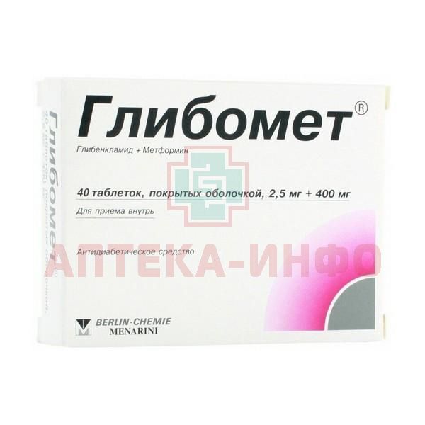 Действующие вещества: метформина гидрохлорид - 400 мг, глибенкламид - 2,5 мг.
