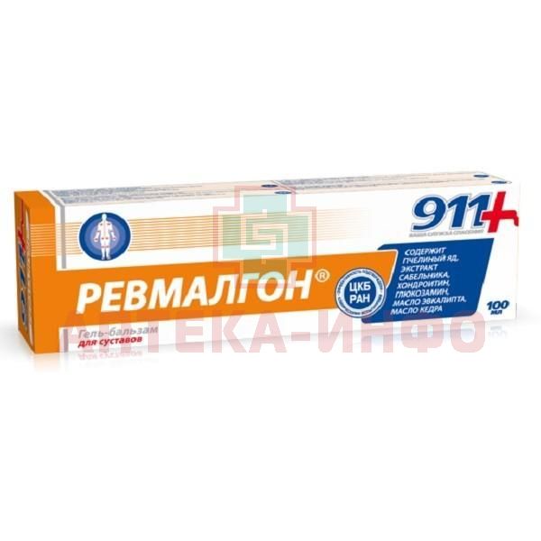 Гель-бальзам товарного знака «Ревмалгон®» серии «911 Ваша служба спасения» гелеобразная текстура от прозрачного до светло-жёлтого цвета